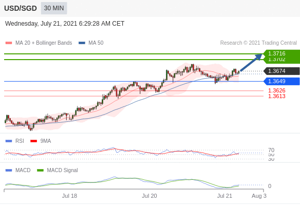 看涨,当1.3649为支撑位。 转折点定在:1.3649 交易策略:看涨,当1.3649为支撑位。 备选策略:如跌破1.3649,UD/GD目标方向定在1.3626和1.3613。 技术点评:RI技术指标超过50。ACD技术指标呈现看多状态并处在其信号线的上方。此外,价位处在其20天及50天移动平均线上方(当前是1.3662和1.3667)。 阻力位: 1.