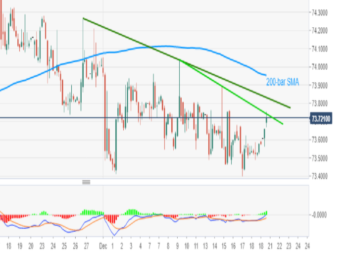 美元兑印度卢比徘徊于自12月9日以来的短期阻力线附近,同时在周一印度交易时段早盘回落至73.71。汇价盘中上涨0.15%。 不仅短期阻力线73.74,自11月27日以来的另一条阻力线73.83也打压汇价。 若ACD指标引发汇价反弹突破73.83,则200A73.95和74整数关口将挑战多头。 相反,短期支持位于73.50和月度低点73