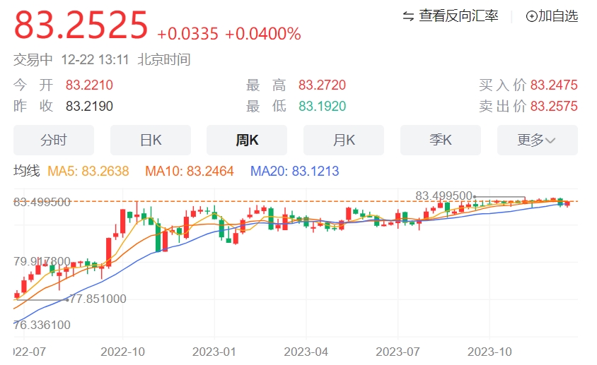 周三亚盘,尽管美元(UD)和美国国债收益率走弱,但印度卢比(IR)周三的交易价格走软。国际货币基金组织(IF)在其年度第IV条审查中指出,从2022年12月到2023年10月,美元/印度卢比汇率在非常窄的范围内波动,这表明印度储备银行(RI)的外汇干预可能超过了管理市场状况所需的水平。 市场走势:印度卢比在多重不利