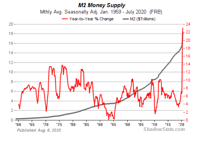 在美联储推出史无前例的宽松货币政策之后,美国的M2就开始像一匹脱缰的野马,狂飙突进,从去年底的6.7%直线飙升到了今年6月的22.9%。