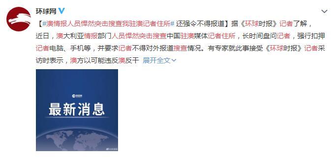 环球时报消息,近日,澳大利亚情报部门人员悍然突击搜查中国驻澳媒体记者住所,长时间盘问记者,强行扣押记者电脑、手机等,并要求记者不得对外报道搜查情况。