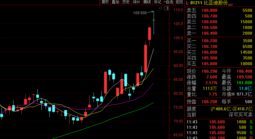 凭借新车强势发布,9月17日比亚迪AH股继续冲击历史新高,比亚迪(002594)最高达112.68元,最新市值2864亿元,位居中国整车企业市值榜榜首;比亚迪股份(1211.HK)涨最高至报109.5港元。