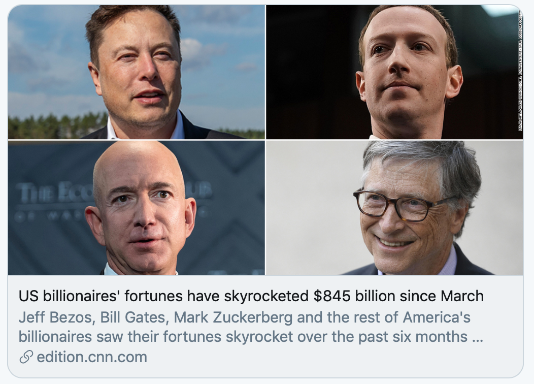 情期间失去了工作。美国亿万富豪3月以来资产增加8450亿美元。/CNN报道截图