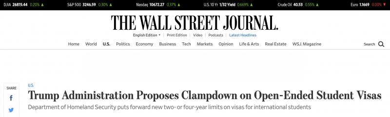 《华尔街日报》报道称,今年,由于美国政府的移民政策和因新冠疫情而采取的旅行限制,许多学校的留学生入学人数都出现了下降。