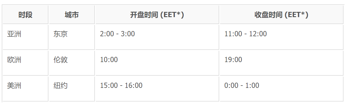 每个交易日可以根据在特定时间段金融中心的活跃程度分为三个交易时段。每个时段开盘和收盘时间基于当地通常商务工作时间:
