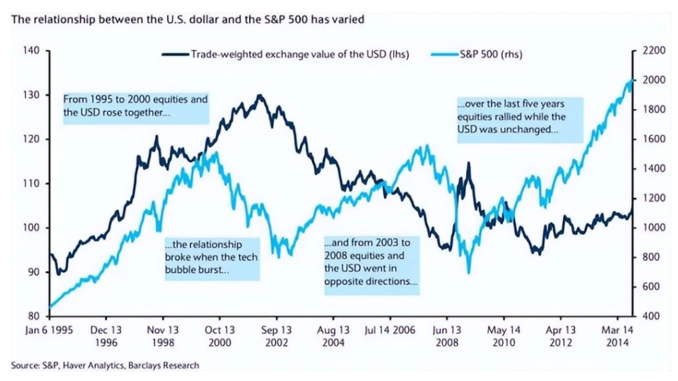 比如说,标普500指数上升,意味着美元升值。但是股指对货币价值的影响并不是绝对的,也有可能会发生如下图的情形,中后期美元价值和标普500走势相反。