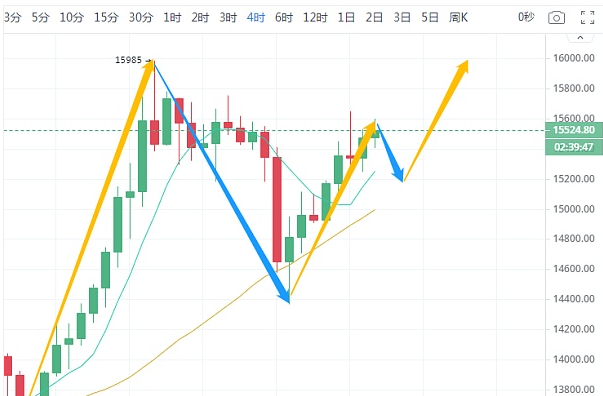 BTC周末走了一个V型反转,最低到达14380附近后触底反弹,最高达到15650附近,而今日凌晨价格再次承压回调,但此次回调的力度不是很大,并未有打破有效的支撑,价格依旧稳定在15500上方,目前还是偏向于多头,日内有望继续上探的可能,4小时图上来看,5日均线穿过10日均线形成金叉,行情处于缓慢上行,目前价格位于布林带中上轨区域,多头攻势并未减缓,但上方承压的价格也以接近,不要盲目追涨,等回调在做进一步多单,日内建议回调做多为主。