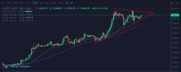 昨日回顾:BTC今日早盘继续一波冲高的走势,现价报15480。目前的整的走势仍维持在我们日前给出的区间内