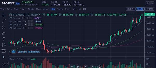 日线图看,目前涨势很强,强压力在日线布林带上轨16660一线,短线回踩支撑位在15600一线,指标上看价格超买严重,但是涨势不减,所以就要防范一下强阻力位的大幅回撤。