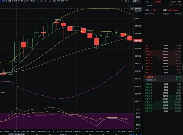 昨晚最高时一度到达19400美元上方,以至于很多人一夜没睡,认为行情会在半夜会突破19800美元想见证历史,可惜后面行情还是没有如大家所愿,从1小时K线图来看,一直在19000美元上方浮动,操作上建议,多单为主。