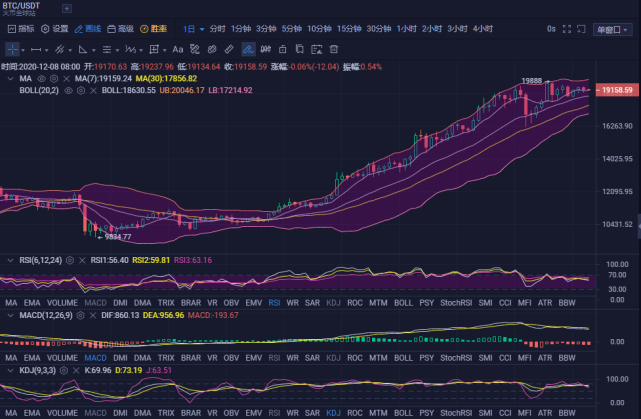 比特币价格昨日延续震荡格局,至此价格已经连续盘整近一周时间,多空胶着的状态后市预计仍是会延续。日线级别看,价格昨日收出小阳结尾,日内凌晨价格走出回落,但整体仍是维持着区间震荡格局,并未能走出破位行情。价格再次回落试探防守线位置支撑后反弹,目前围绕在攻击线附近运行。攻击线目前于19100附近盘整。布林带走势渐有收口迹象。
