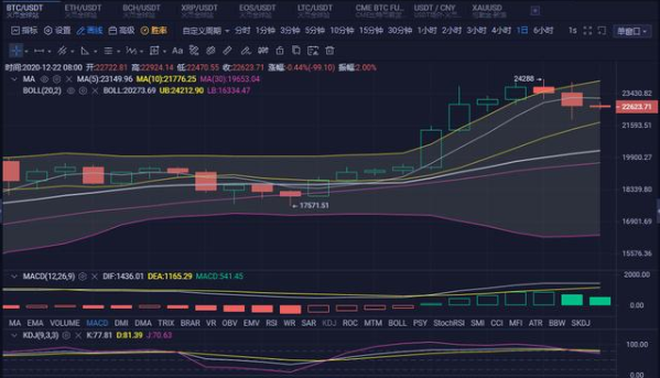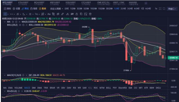 小时图来看:BOLL通道呈向下收口之势,币价处于小时线中轨下方运行;附图指标中;MACD快慢线在零轴下方死叉向下发散,红色量柱再次放量,KDJ三线向下发散;比特币昨日可谓是大涨大跌,高点触及24288美元位置后,行情走出千余点回调,随后多头发力开始收复失地,可惜后续走势并未企稳24000美元一线位置,行情再度出现大幅回调,并且跌破23100美元关键支撑,价格二次下跌,行情深度回调再落千点,低位触及21900美元一线。日内需重点关注下方22100,21400俩个支撑位,上方23000的整数关口破位情况。