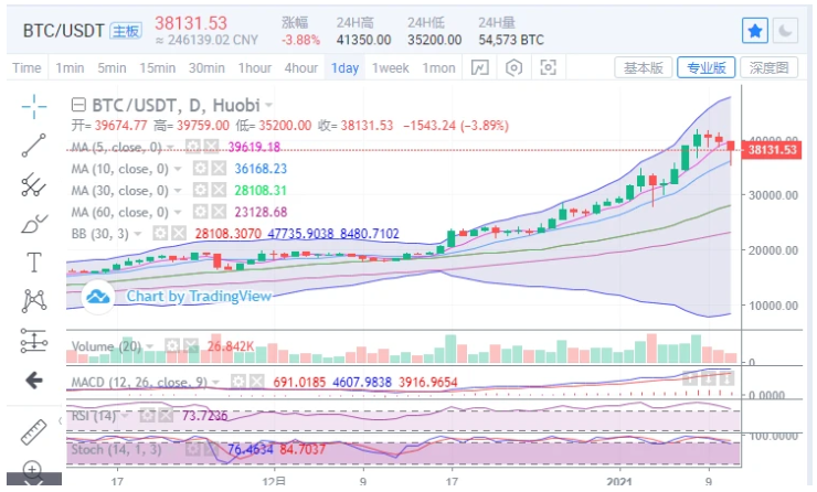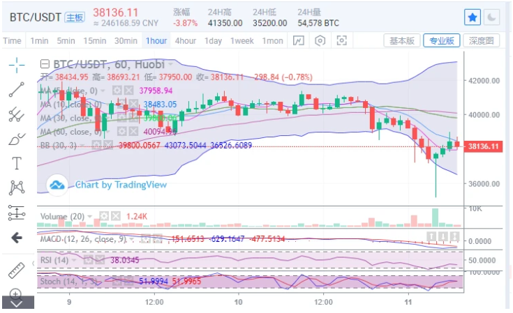 比特币昨日白盘行情维持高位盘整,价格在千余点区间内上下波动,下方支撑关注40000关口。晚间行情破位下行,短时价格暴跌千点,低位触及38500位置情况才逐渐好转。日内凌晨延续下行姿态,四点开盘后更是出现插针行情,低位进一步跌至35200一线。目前价格反弹在38500位置,日内行情大跌大涨,楚初建议各位币友合理控制风险。
