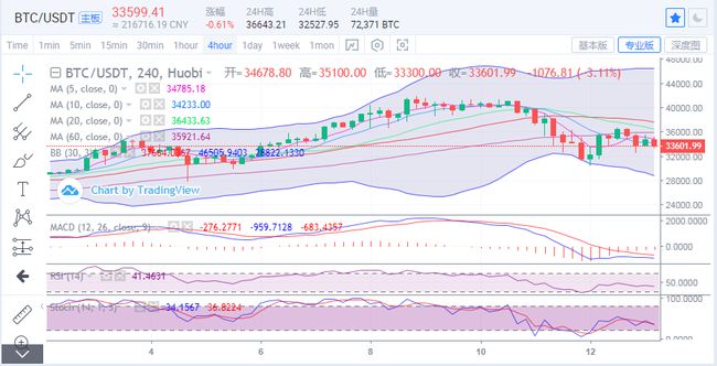 比特币昨日走了一波冲高回落,高位触及36643附近,日内价格自凌晨开盘33833位置上行,高位触及35545附近后承压回落,下行至33300附近,目前还在不断下探中