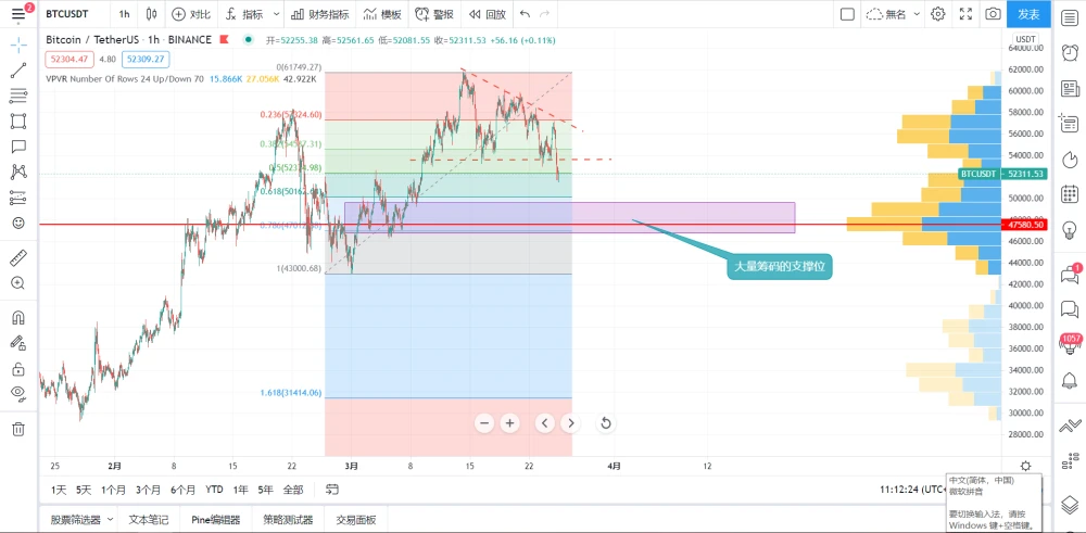 价格收破支撑位,从筹码指标看,上面套住了大量散户,主要套牢区在56000,试想一下,如果你是庄家,刚把韭菜套住,会那么好心,再让价格上去给他们解套吗?不会,所以结合技术面分析,价格只有进一步下跌。那么下面的支撑位,在50000至47000美元,再拉出黄金分割线,可以得到第一个较为精准的支撑位在50150美元的位置,可以进行短线多单布局,止损设置小一些,止盈可以500至1000美金然后上移止损,有利润就保护好本金,当然,个人更推崇右侧交易。
