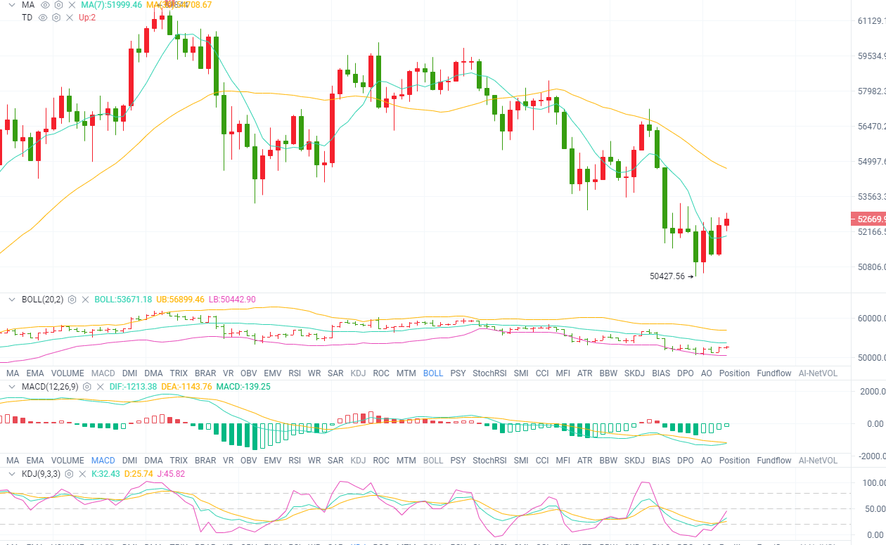 4小时图看,布林带呈下行趋势,10日均线下行姿态运行, 5日均线拐头向上,币价短期在中轨与下轨区间震荡,MACD快慢线在0轴下方有形成金叉趋势,空头能量柱缩量明显,KDJ三线交叉向上发散,指标上看多头有所回暖迹象,短线操作方面可进行一波多单。