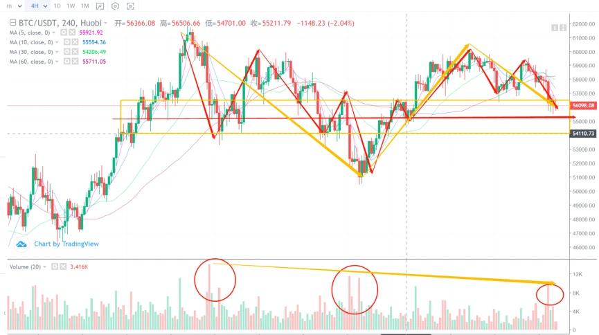 53000-54000左右是最大可能性的底部区间位置。这个过程还需要一些时间,至少是4*4*N周期,也就是说至少34-56个4H周期K线才基本可以完成。