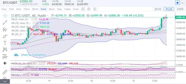 比特币日内午后行情突破61400-61800压制区域,刷新历史高位,价格走出强势上涨,目前高点在63100位置,这波破位上行涨幅达到1300多点,将多头情绪再度点燃,同时将上空间进一步打开,后续若是再度突破,涨幅有望进一步延续。