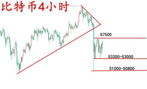 从4小时我们可以到,进几日的下探是比较迅猛的,每一轮的探底回升都未能突破前高,呈现阶梯式的下行,而下方主要支撑在53000一线,4小时呈现双底支撑,若是能打破这一支撑,那就是说明空头真真的走出了多空争夺区域,正式进入了单边下行的节奏。