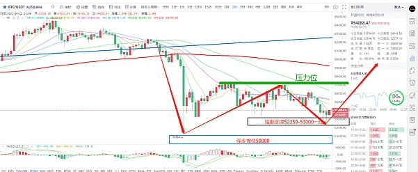比特币昨日反弹受阻于56400附近,未能继续向上突破57000大关,今日凌晨币价继续下跌,截止目前走势小幅放量下破53000支撑大关失败,1小时走出较长下影线形态,这意味着在短期多空较量过程中,多头力量比较疲软。鉴于短期走势不确定性比较强,若后续空头继续放量抛压,投资者仍需关注下方53000支撑大关的有效支撑情况,有效跌破则直接看至5万整数位强支撑,出现缩量下跌形态则表示后期形成标准双底W大概率将成型。倘若53000始终未被跌破,则反弹大概率将提前。 多头势力仍处于弱势蓄力阶段,大方向依然是震荡下行趋势中,操作上鬼谷论市建议有反弹高点做空为主,低位企稳做多为辅。顺势而为方能轻松获利。
