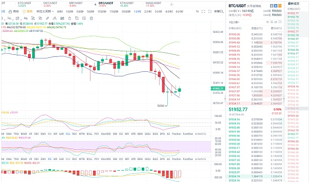昨天比特币的行情还是一样的弱势震荡,近期连续走出新低。以太坊虽然强势扛旗上涨,但是依然带动不了整个币圈,还是处于上攻乏力的状态。比特币一小时图来看,k线跌破下轨,最低回撤50500止跌反抽,现在价格回到下轨区域里运行,但布林通道呈开口走势,五日均线与十日均线均向下探底,整体趋势偏空,技术面指标来看,MACD快慢线呈死叉向上,红色量能柱有缩量迹象,短期价格可能会有轻微的反弹,结合KDJ、RSI走势图来看,目前的行情趋势依旧偏弱,对此,东哥建议各位币友如果没有把握,近期还是多观望,少操作为宜。早间可以轻仓看一波反弹。