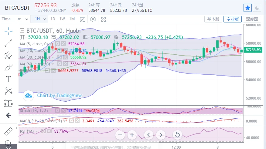 比特币昨日走势维持宽幅震荡,多空双方胶着在区间日内来回波动,低位触及55000一线支撑走出反弹。日内行情比特币是冲高回落,价格在58700位置出现承压,当前走势回调千余点在57000一线运行,价格有再度下探的风险。