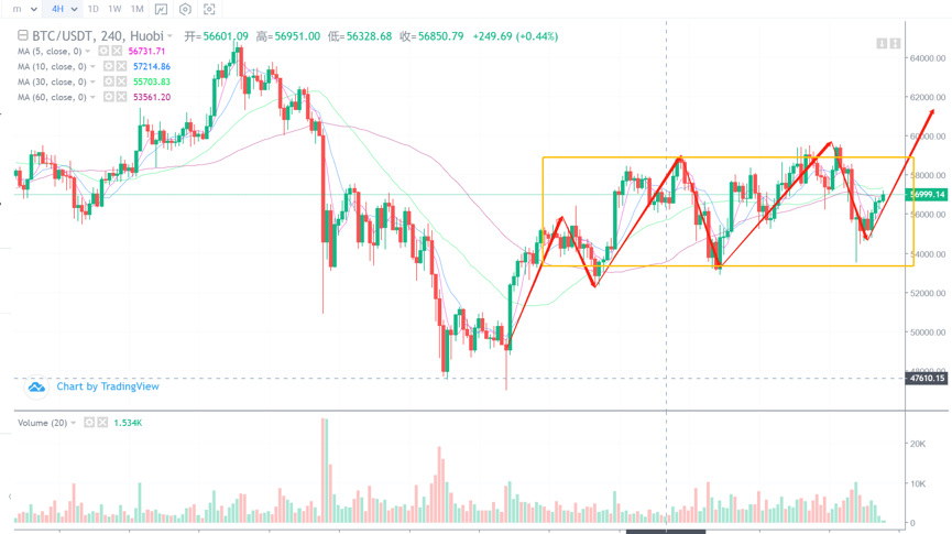 废话不多说,看BTC的技术走势,现在仍在4H-日线中枢(为了大家能够看懂,以后写成这个结构,说明就是4H的结构完全构成日线的中枢,而日线的中枢其实就是代表日线的K线密集区平台),那么后面的走势,有一个点是可以确定的,就是下跌破底部的风险是解除了的。