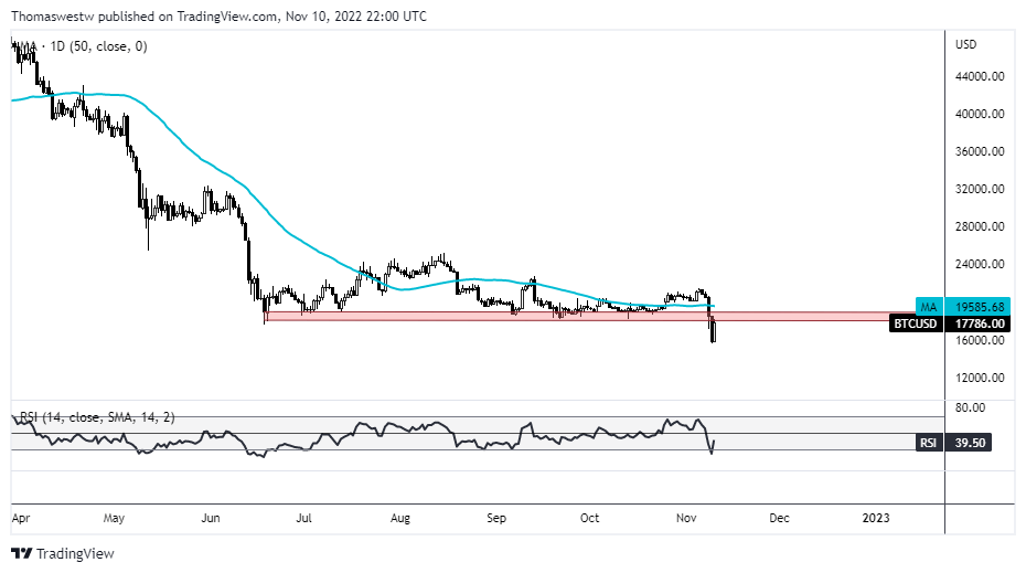 比特币大幅逆转,上涨了12%,但价格仍低于50天简单移动平均线(SMA)和最近突破的支撑区域,支撑了自6月以来的盘整期。如果价格在前支撑区下方收盘一周烛台,可能会出现更多下行空间。