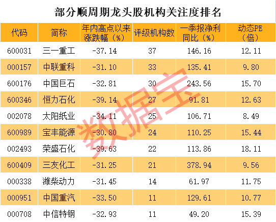 数据统计显示,最新市值200亿元以上、评级机构数10家以上且最新价较年内高点跌幅超过30%的顺周期股中,有11股一季报净利同比增长超过40%且动态市盈率在30倍以下。从超跌幅度来看,荣盛石化最新价较年内高点跌幅接近40%居首。恒力石化、三一重工等个股超跌幅度均超过34%。