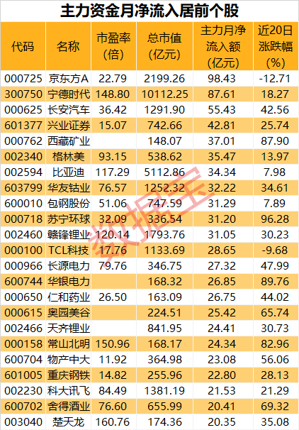 数据统计显示,5月共有23只个股获主力资金净流入超过20亿元,月净流入最高的是京东方A,5月累计净流入98.43亿元;其次是宁德时代,累计净流入87.61亿元;其他净流入较高的还有长安汽车、兴业证券、西藏矿业等。宁德时代昨日上涨5.98%,股价成功突破万亿大关。