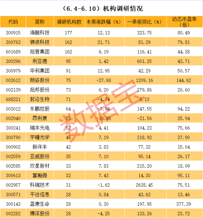 近一周机构调研的上市公司中,金融街、鞍钢股份、蓝帆医疗、*ST中孚、城发环境、中原高速等个股一季报净利同比增长均超100%且动态市盈率低于10倍。净利增速方面,蓝帆医疗一季报净利同比增长超10倍居首。市盈率角度看,蓝帆医疗和中原高速两只个股市盈率均低于6倍。
