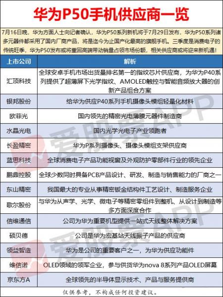 尽管由于商业机密原因,目前我们暂且不知道P50系列的合作上市公司,但却可以从该系列上一代产品P40、P30供应链大致推测P50系列可能的合作上市公司。比如屏幕方面,P50是维信诺直屏,P50Pro+是京东方四曲面曲屏,P50Pro则是两家混合的双曲面曲屏。相关供应商:汇顶科技、银邦股份、欧菲光、水晶光电、长盈精密、蓝思科技、鹏鼎控股、东山精密、歌尔股份、信维通信、硕贝德、领益智造、维信诺、京东方A。