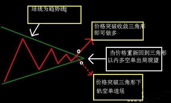 三角形一般我们用肉眼即可辨认,要是看不清的话可以画上线段加以确认,开仓区域在于三角形的末端,一旦价格到达这里我们要时刻盯盘,观察它的突破方向,这种形态是种上下两可的形态,价格突破之前不要主观判断。