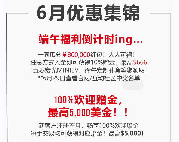 端午惊喜倒计时ing…手慢无!①人人可得,瓜分总价¥600,000红包!②10%入金赠金,最高可获得$666;③更有五菱宏光INIV、端午定制礼盒等您领取!6月29日准时登陆官网/互动社区查看获奖名单! 端午节积分商城550积分抽大奖,五粮液特曲皇冠版白酒、赠金等丰厚好礼,陪您放“粽”一夏! 交易之余,别忘了每日微信打卡哦