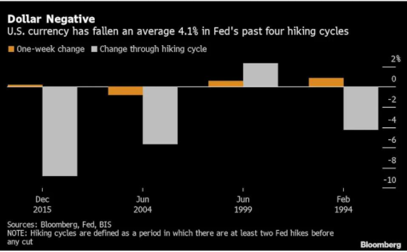 美元指数:在外汇市场方面,尽管人们印象里可能会认为美联储加息理应推动美元走高,但基于美联储和国际清算银行(BIS)可追溯到1994年的数据,在FOMC之前的四个紧缩周期中,美元平均下跌4.1%,原因是投资者将加息视为买入成长性资产的理由。当然,目前并非所有人都相信美元眼下的涨势已接近尾声。如果事实证明美联储本周的鹰派立场甚至比预期更强,那么投资者可能会认为这是加入追逐美元涨势的另一个原因。