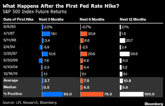 美股市场:从历史上看,尽管在美联储开始加息之后,美国股市往往会出现更大的波动,但这并不意味着就必然会呈现持续性的疲态。事实上,根据LPL Financial的统计,在之前的8次加息周期中,标普500指数在每次加息一年之后都达到了更高点位。在过去的三十年里,美联储总计经历了四个加息周期,没有一次利空股市。科技股今年因加息步伐加快的前景而大幅动荡,但根据Strategas Securities,在这几次加息周期中,科技股通常是标普500指数表现最佳的板块之一,涨幅接近21%。不过,总体而言,数据显示领涨板块各不相同,没有哪一个板块在所有四次周期中都表现突出。