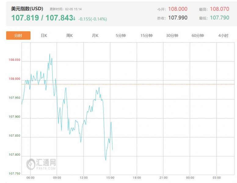 周三(2月05日)亚盘早盘,美元指数最新价报107.843,跌幅0.14%,开盘价为107.819。