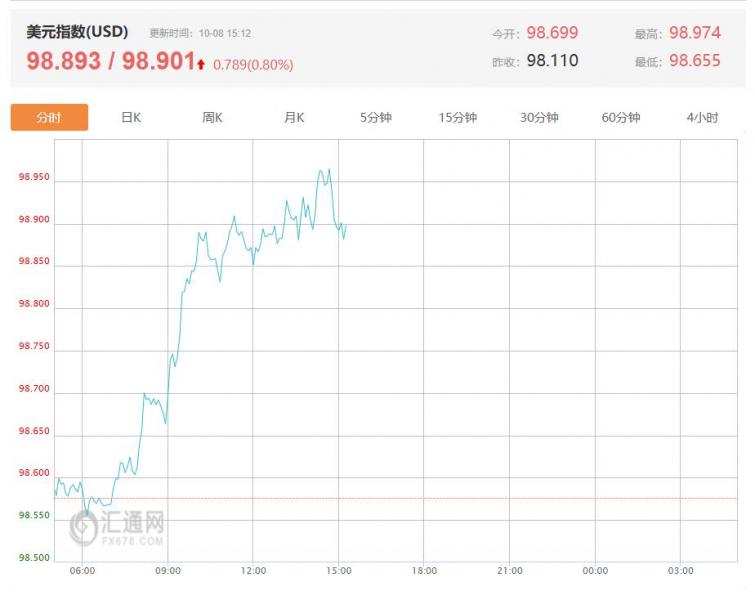 周三(10月8日)亚盘时段,最新美元指数报98.901,涨幅0.80%,可以在99.00---98.20的区间下限买入,有效破位30个点止损,目标在区间的上限。