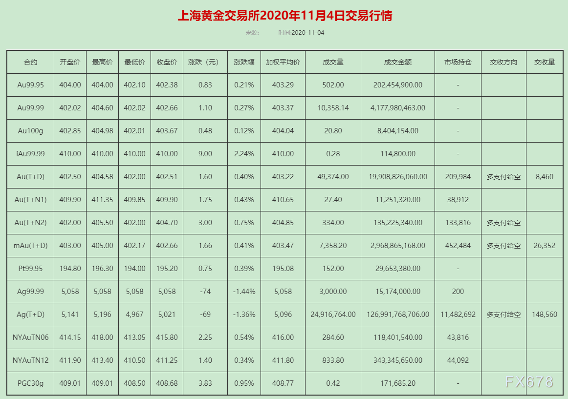 ① 黄金T+D收盘上涨0.40%至402.51元/克,成交量49.374吨,成交金额199亿882万6060元,交收方向“多支付给空”,交收量8.460吨;