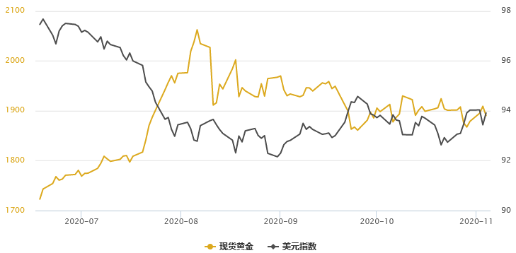 周三(11月4日)现货黄金盘中创近两周新高至1916.56美元/盎司,但随后一度下挫逾30美元,因市场对特朗普胜选的预期升温,这令美元指数大幅走高,创逾五周新高。