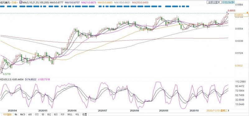提醒, 11月10日,纽元兑美元在连涨六个交易日后上涨动能有所减弱,目前仍维持在逾一年半高位附近,如果周三新西兰联储为推出新的刺激措施做铺垫,为未来实行负利率铺路,纽元将面临一定的回调风险,甚至是见顶风险。