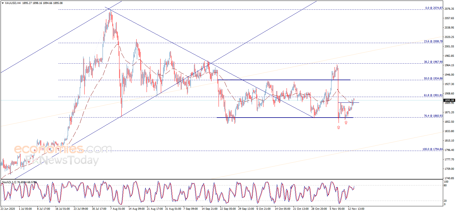 周一(11月16日)亚市尾盘,现货黄金交投在1891美元/盎司附近,已经脱离日内高点,亚市早盘金价一度逼近1900美元/盎司关口。知名财经资讯网站Economies.com周一撰文,对日内欧元/美元、英镑/美元、美元/日元和黄金走势进行前瞻分析。
