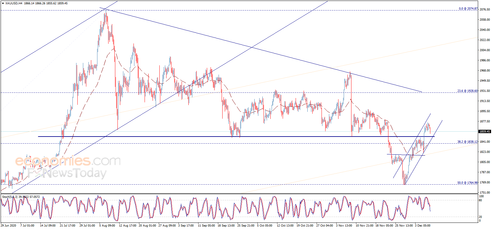 周三(12月9日)欧市早盘,现货黄金继续承压,金价现报1860美元/盎司附近。知名财经资讯网站Economies.com周三撰文,对日内欧元/美元、英镑/美元、美元/日元和黄金走势进行前瞻分析。