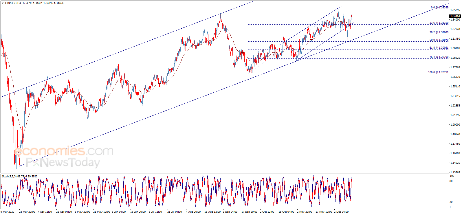 从4小时图来看,EMA 50指标对英镑/美元构成支撑;只要维持在1.3335上方,那么看涨预期仍将有效。