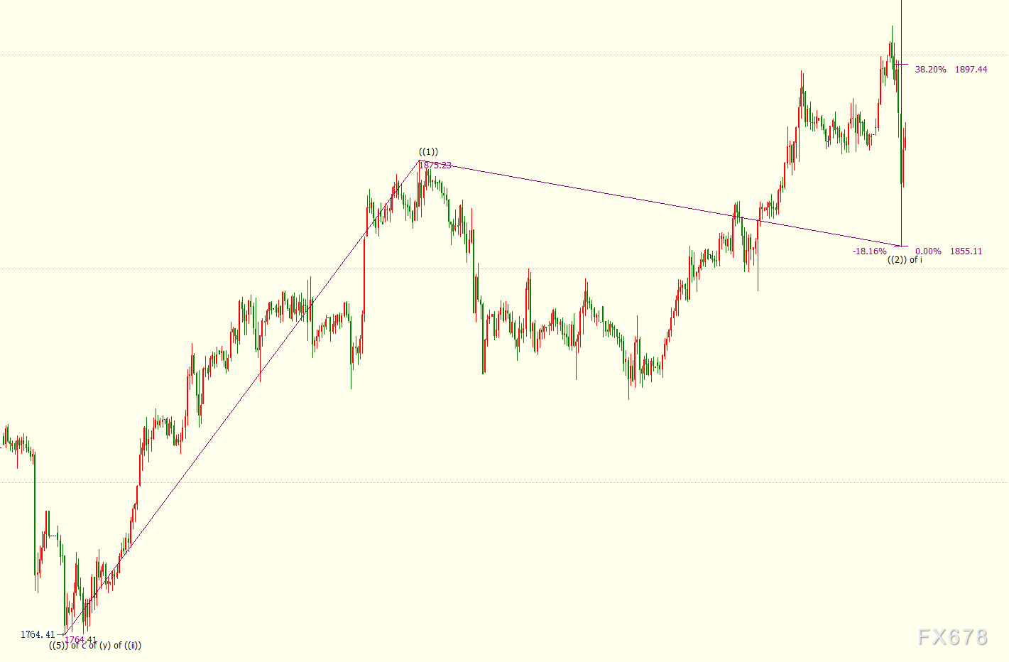 现货黄金处自1875美元开启的调整((2))浪走势出现延伸,但后市仍看涨。若金价在1855美元结束((2))浪,并开启上行((3))浪走势,那么金价已升破((3))浪23.6%目标位1881美元,新的阻力位上看((3))浪38.2%目标位1897美元。((2))浪和((3))浪是自1764美元开启的上行i浪的子浪,i浪是同样从1764美元开启的上行(i)浪的子浪。