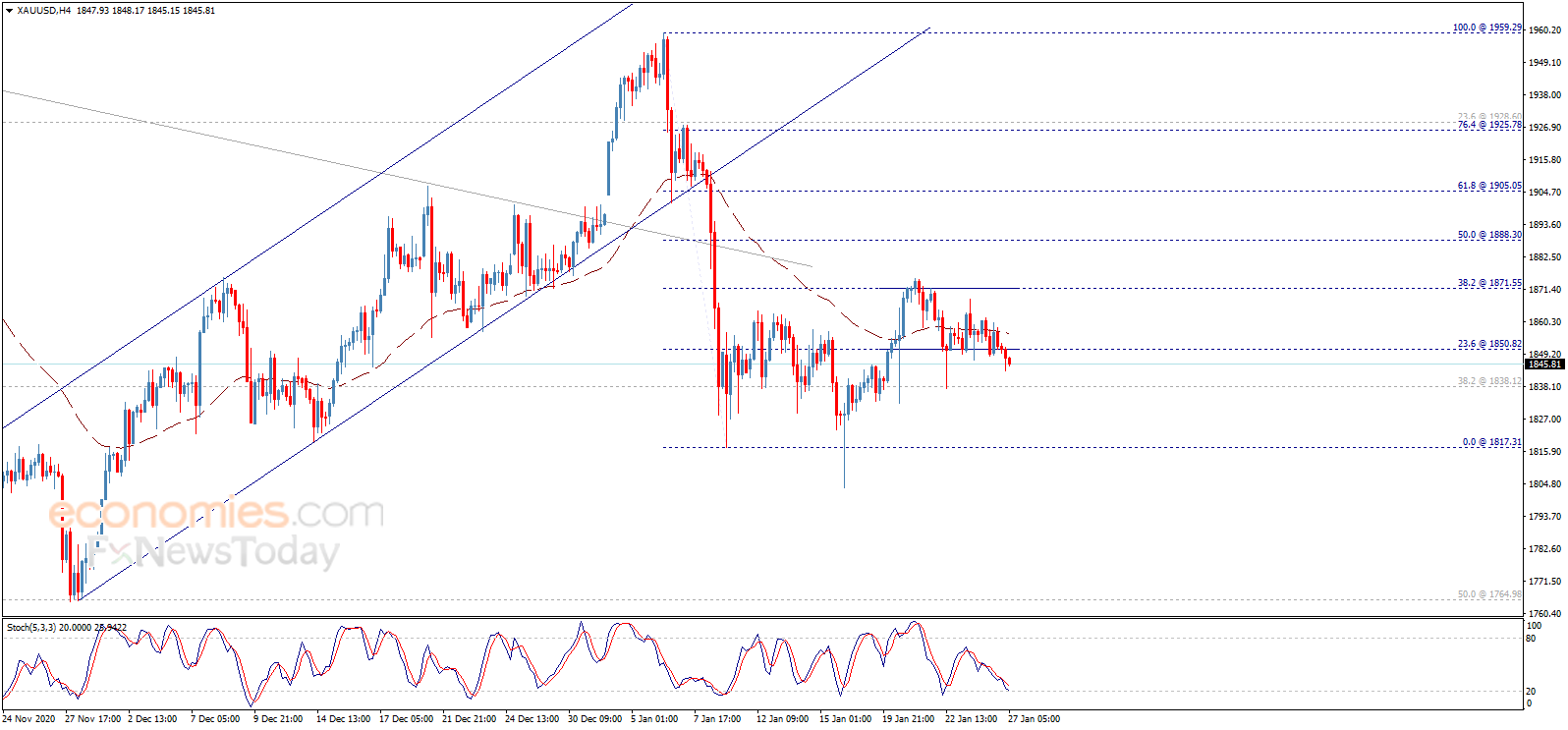 因此,预计金价在未来几个交易日处于看空趋势。从4小时图来看,EMA 50指标形成看空压力。金价需要保持在1850.80美元/盎司下方,以继续下跌走势。
