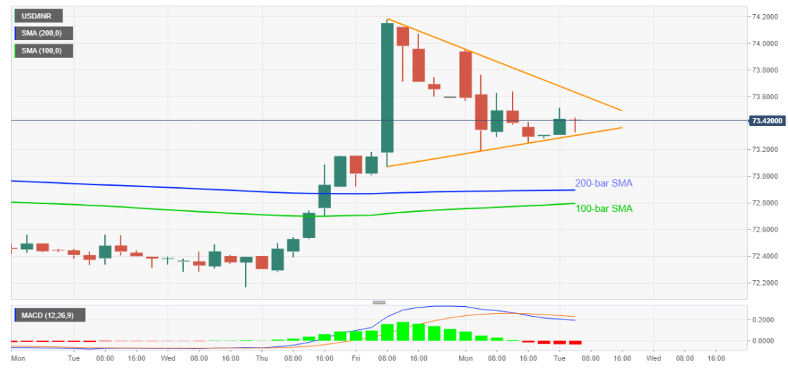 技术面显示,汇价4小时图录得看涨形态。虽然MACD看跌,跌破旗形支持73.30将令其看涨信号失效,但100SMA和200SMA分别位于72.90和72.80将构成支撑。