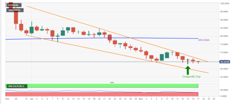 尽管美元/卢布未能延续最近触及数月低点的跌势,但在200日移动均线下方持续交易,且月度下跌趋势线,构成了下行楔形的看涨形态的一部分,对反弹走势构成挑战。