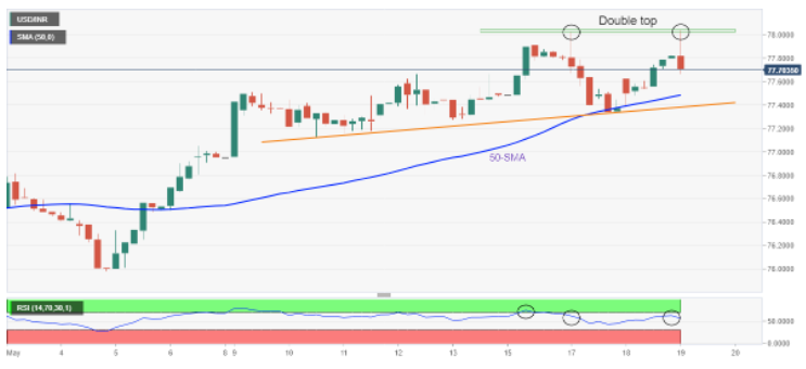 技术上,汇价在4小时图上形成一个看跌的“双顶”形态。同时RSI熊背离,也令空头充满希望,价格录得更高的高点,而RSI录得更低的高点。不过汇价必须明显跌破最新低点77.33才能确认看跌形态。