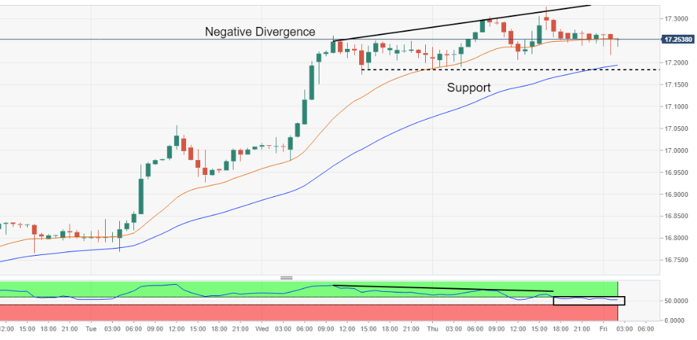 土耳其里拉多头持续测试20周期指标均线附近的 17.25 水平。尽管处在 17.19 附近的50 指数均线正朝北,汇价并未触及该水平,但这表明短期趋势仍然有利于多头。